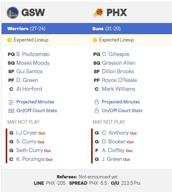 - Absence Factor: Phoenix Advantage (GSW missing three core starters is catastrophic)