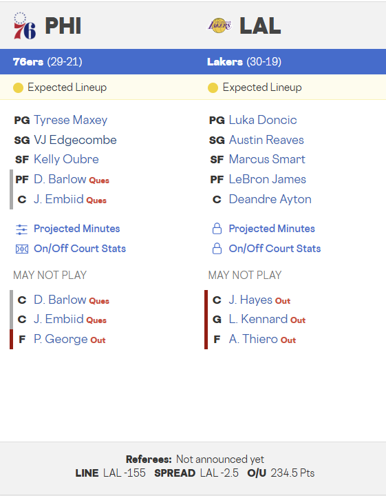 - Absence Factor: Philadelphia Edge (1 key starter out vs 3 rotation players out for LAL)