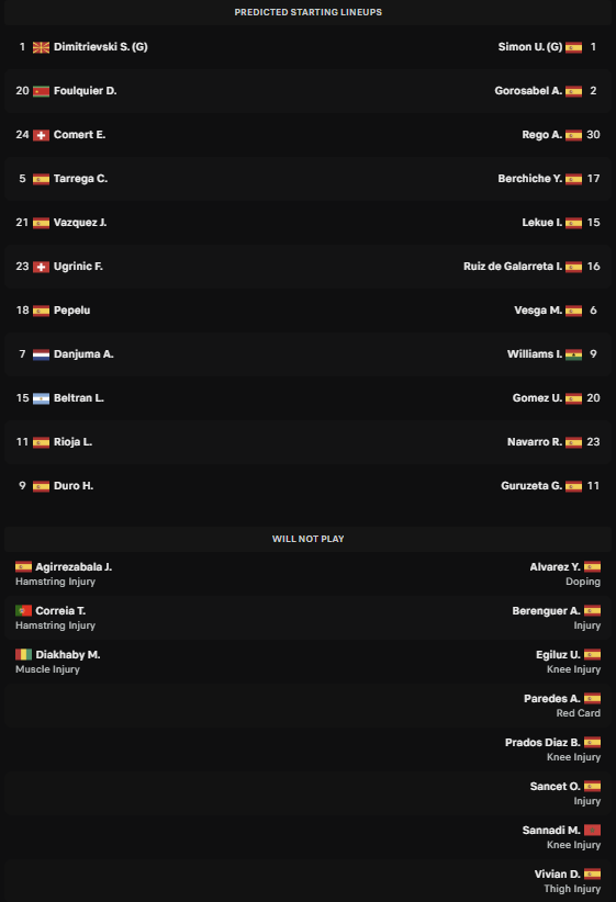 Valencia deploys a 4-4-2 base with Stole Dimitrievski (#1) in goal, supported by Tárrega (#5) and Cömert (#24). Pepelu (#18) and Beltrán (#15) anchor the midfield to provide opportunities for Hugo Duro (#9) in a pragmatic style. Athletic Bilbao counters with a 4-2-3-1, relying on Unai Simón (#1) and the pace of Nico Williams (#9). However, with the simultaneous absence of Vivian and Paredes, Bilbao’s rear stability is projected to decrease by over 65%.